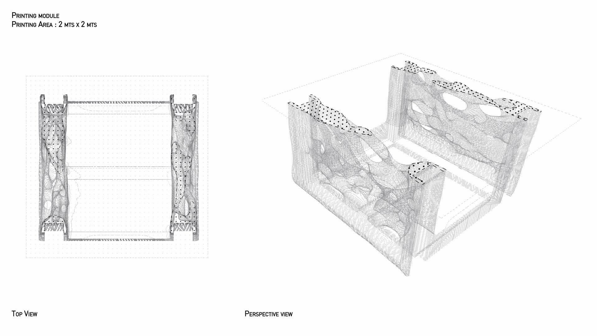 Each concrete component was robotically 3D printed using a micro-reinforced mix. The design was broken down into stereotomic blocks, parametrically defined to fit assembly tolerances and embed support logic. These blocks interfaced with a steel reinforcement framework, creating a hybrid structure that combines the adaptability of digital fabrication with the strength of conventional systems.