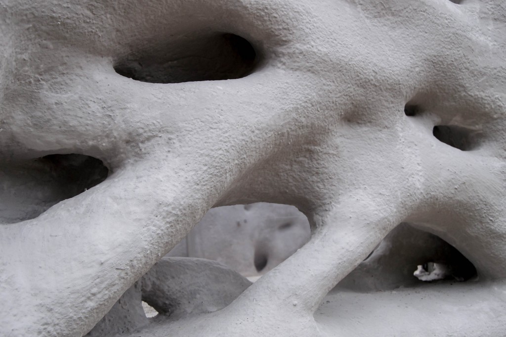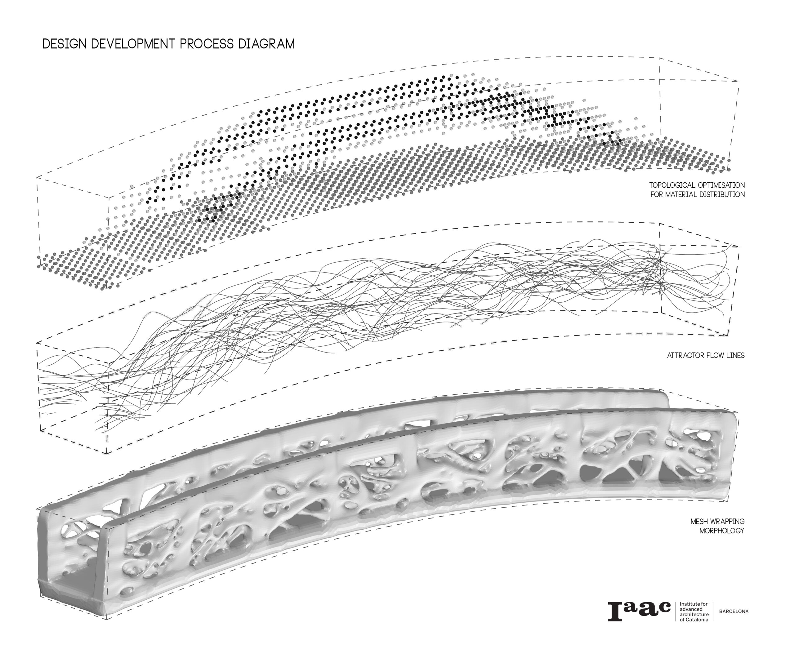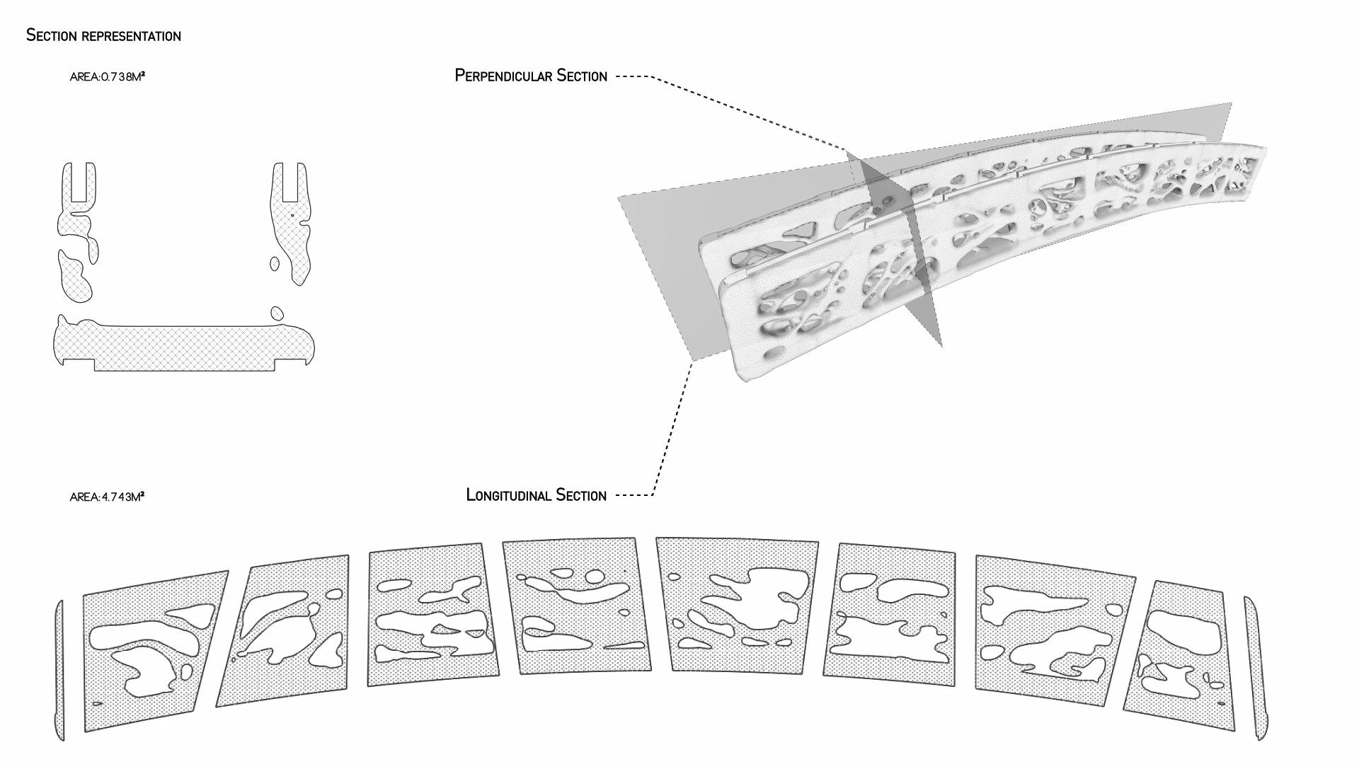 At a more detailed scale, agent-based simulations introduced controlled porosity where structural demand decreased or acoustic transparency was required. These behaviours enabled the geometry to adapt locally, balancing efficiency with experiential qualities. Topological optimization further reduced material usage, while curvature-driven force flows guided load distribution. Finally, the bridge was discretised into stereotomic pieces, each designed for modular fabrication and reinforced by a hidden steel structure—seamlessly linking computational logic to constructability.