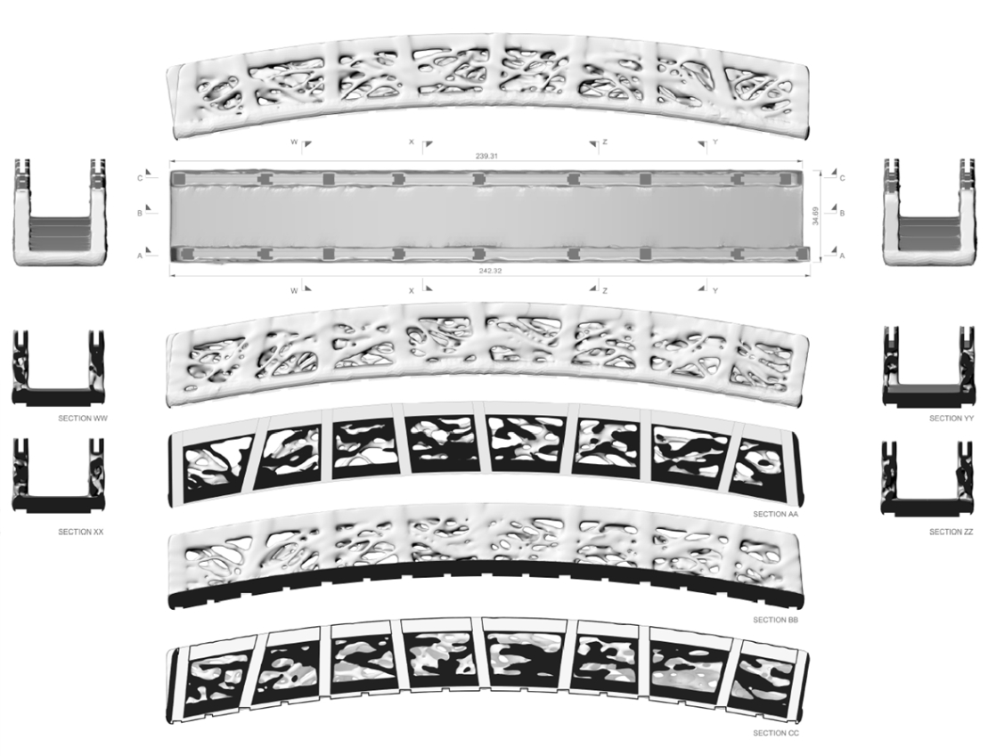 The bridge was developed through a fully parametric workflow that integrated structural logic, spatial performance, and fabrication constraints into a single generative system. Instead of designing form and performance separately, the process allowed geometry, structure, and material behaviour to evolve in parallel. Performance-based simulations informed the global curvature and section profiles, ensuring that structural efficiency and spatial qualities were embedded from the outset.