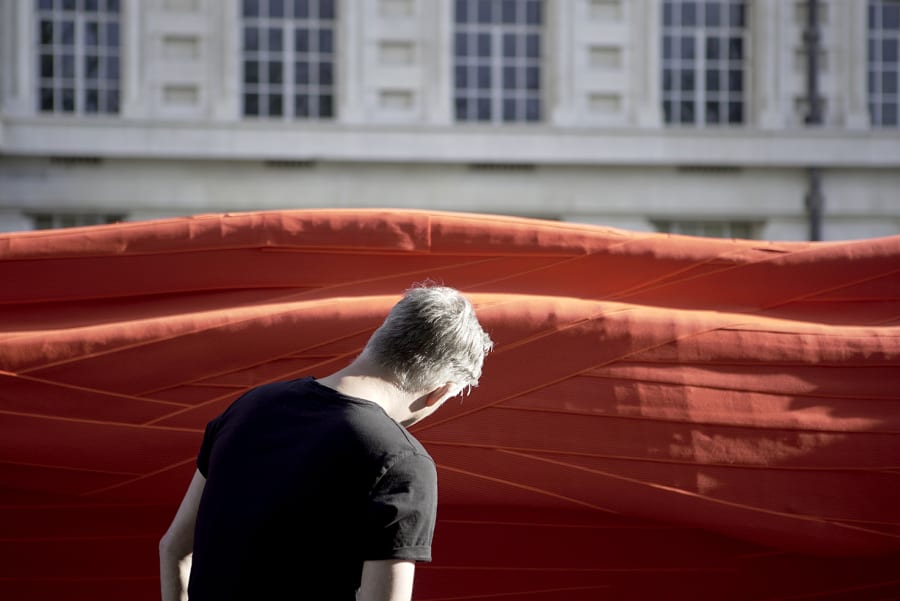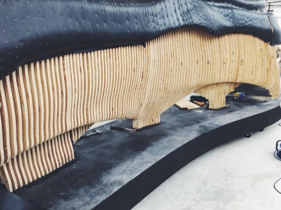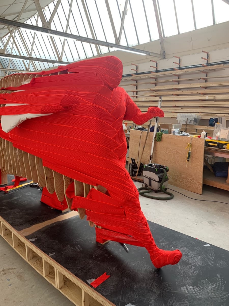 The model was sliced into 400 vertical cross-sections, CNC-cut into wooden ribs that formed the supporting framework. Onto this skeleton, Nemeziz Straps—the same material used in the boot design—were tensioned to create a fluid volume that evokes frozen motion.
