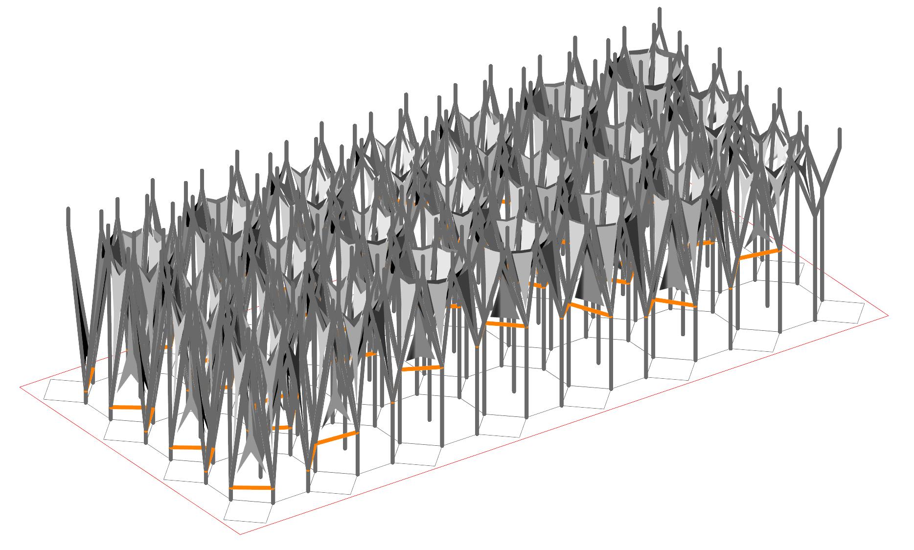 Delta Z challenges the superficiality of two-dimensional geometric systems by giving them structural depth, transforming them into spatial constructs with inhabitable potential. Rather than conforming to typologies like canopies, pavilions, or buildings, this research investigates how mathematical grid systems—when parameterized and materialized—can evolve into three-dimensional structural environments.