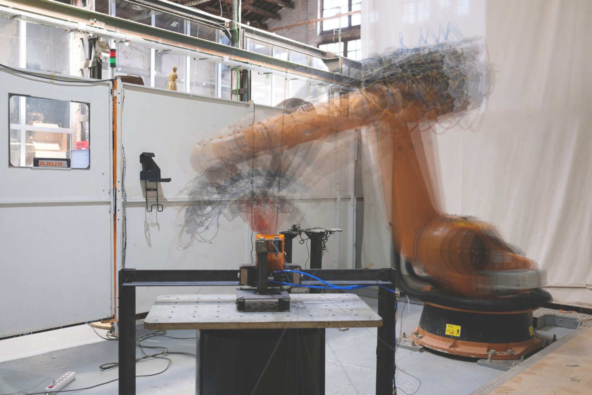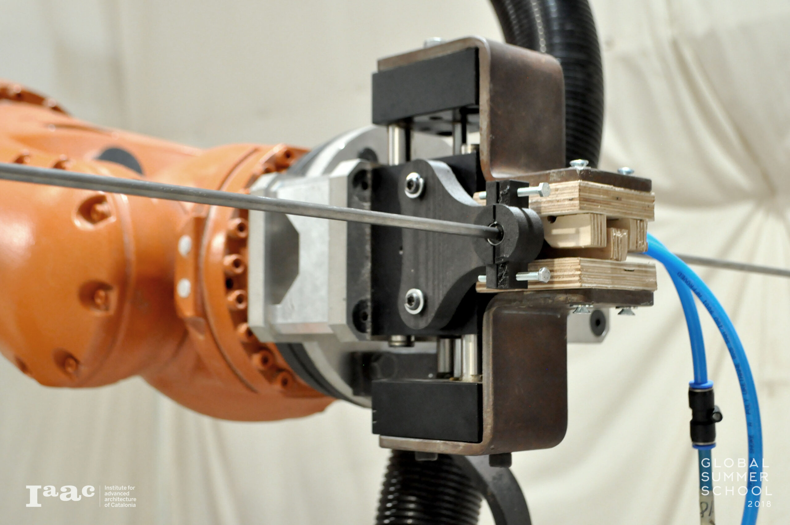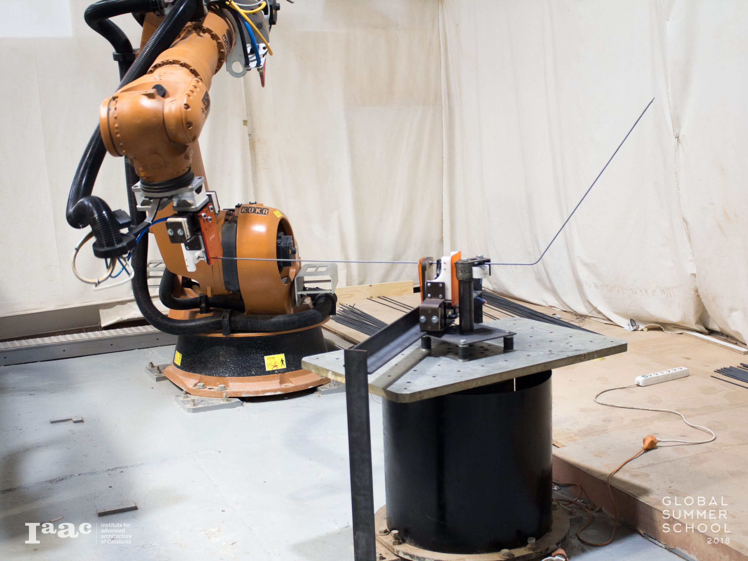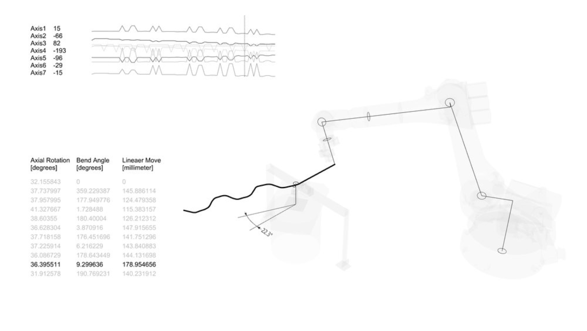 The pavilion’s design is grounded in a fully digital workflow, where computational logic governs every aspect of the process—from geometric definition to robotic execution. The structure’s primary material, steel rod, is manipulated using a 7-axis KUKA robotic arm, enabling precision-bending of complex geometries that defy conventional methods.