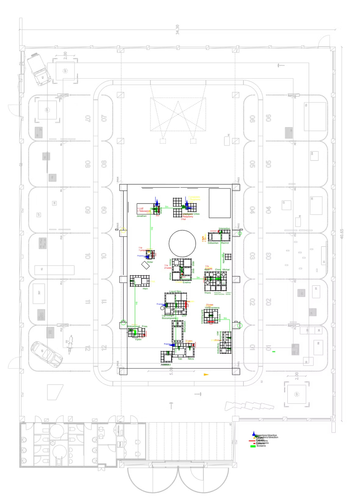 The exhibition was held in a 200-square-meter industrial hall at MUHBA Oliva Artés, under strict spatial constraints: no contact with walls or ceilings, no fixed lighting or hanging elements, and an unknown set of over 50 prototypes to be accommodated on-site. These limitations required a computationally-driven solution that could rapidly adapt to changing inputs while maintaining a cohesive and legible spatial narrative.
