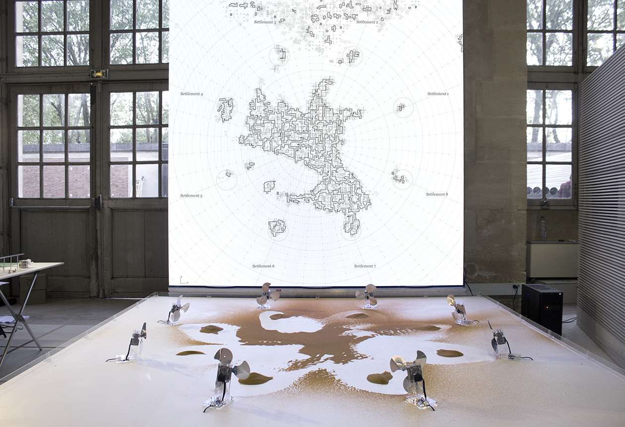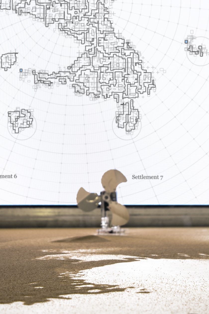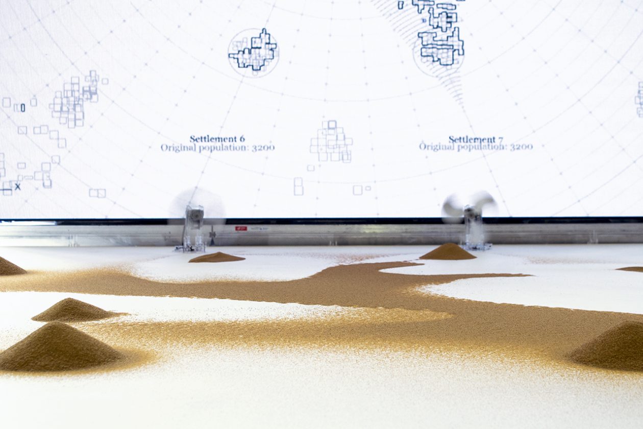At its core, the project unfolds as a live, protocol-driven performance. On a horizontal surface, fans move across a bed of sand, creating constantly evolving dune formations. Simultaneously, a generative architectural drawing is projected onto a vertical canvas, responding in real time to the changing terrain. If the wind reshapes the sand, the drawing reorganizes urban forms to adapt. Inversely, if the digital city reaches certain density thresholds, the system intervenes physically, altering the sandscape. This establishes a closed feedback loop where geology and urbanism co-evolve—each informing the other continuously.